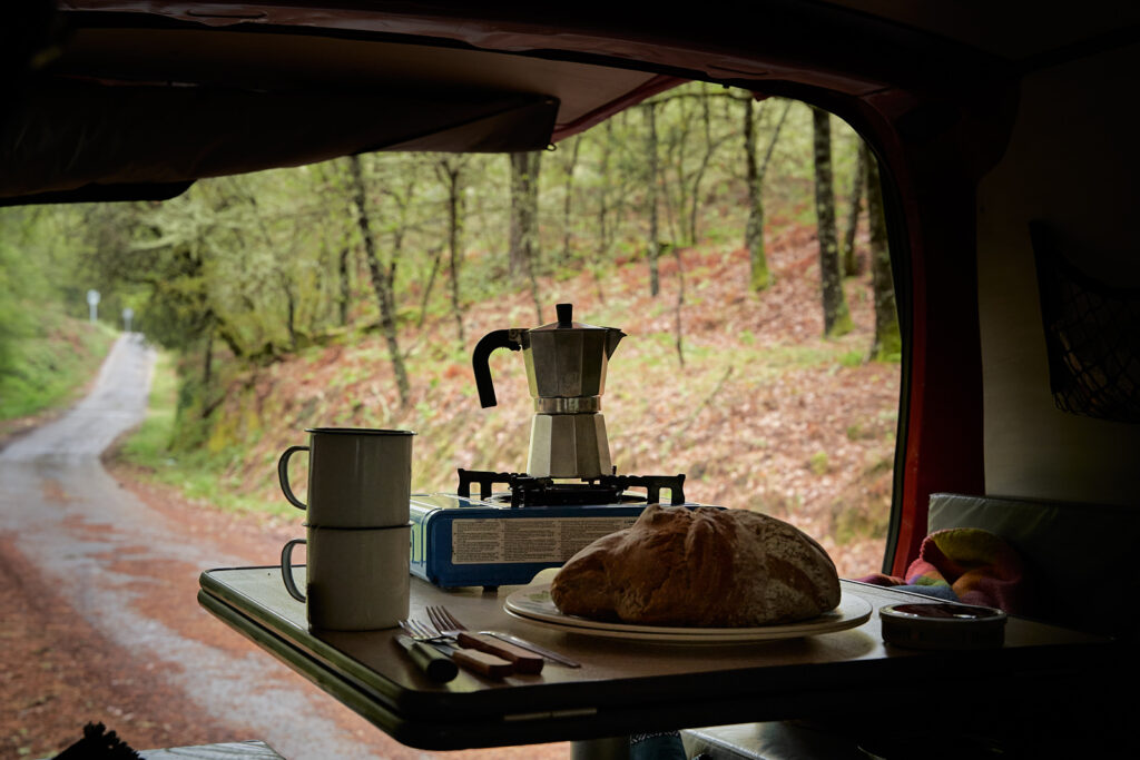 Despertamos con lluvia y cielo cerrado. Como somos personas previsoras y no queríamos sustos, lo primero fue echar gasoil en Vilarchao. En esta zona es muy probable que no te encuentre gasolineras hasta dentro de muuuuchoos kilómetros. De camino pillamos pan en la Panadería Melias de Pereiro de Aguiar (buenísimo) y nos fuimos a desayunar y a ducharnos discretamente un poco apartados.